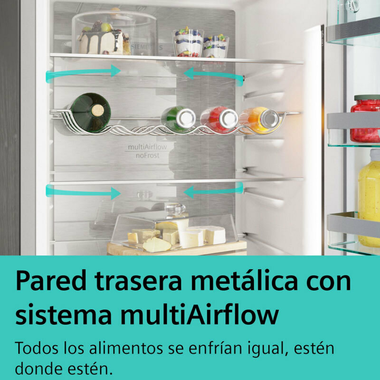 *¡¡Gran capacidad:!! Los compartimentos grandes y la capacidad de almacenamiento extra, ofrece un espacio suficiente para toda la compra semanal gracias a su gran capacidad. Mantén tus opciones culinarias abiertas. *¡¡Hyper fresh 0ºC:!! Llena tu nevera con todas las frutas y verduras que quieras. Y para las carnes y pescados, tienes un compartimento con su propio suministro de aire frío, que mantiene los alimentos en perfectas condiciones durante más tiempo. Más espacio y conservación ideal, en un mismo sistema. *¡¡No frost:!! Se acabó el descongelar el frigorífico para conservar correctamente los alimentos y no malgastar energía. La tecnología noFrost extrae la humedad y mantiene seco el aire dentro del frigorífico. Esto evita que se forme escarcha en las paredes interiores o los alimentos, para que no tengas que descongelarlo nunca. Además, ahorra energía, porque un congelador sin escarcha consume menos. *¡¡Pared trasera metálica con Multi AirFlow:!! ¿Quieres asegurarte de que todas las partes de tu frigorífico enfrían igual? La pared trasera metálica con el sistema multiAirflow hace que el aire circule de manera uniforme dentro del frigorífico para que la temperatura sea constante en todos los niveles. Así, cuando metes alimentos en cualquier parte de la nevera, se enfrían rápidamente y se conservan frescos durante más tiempo.