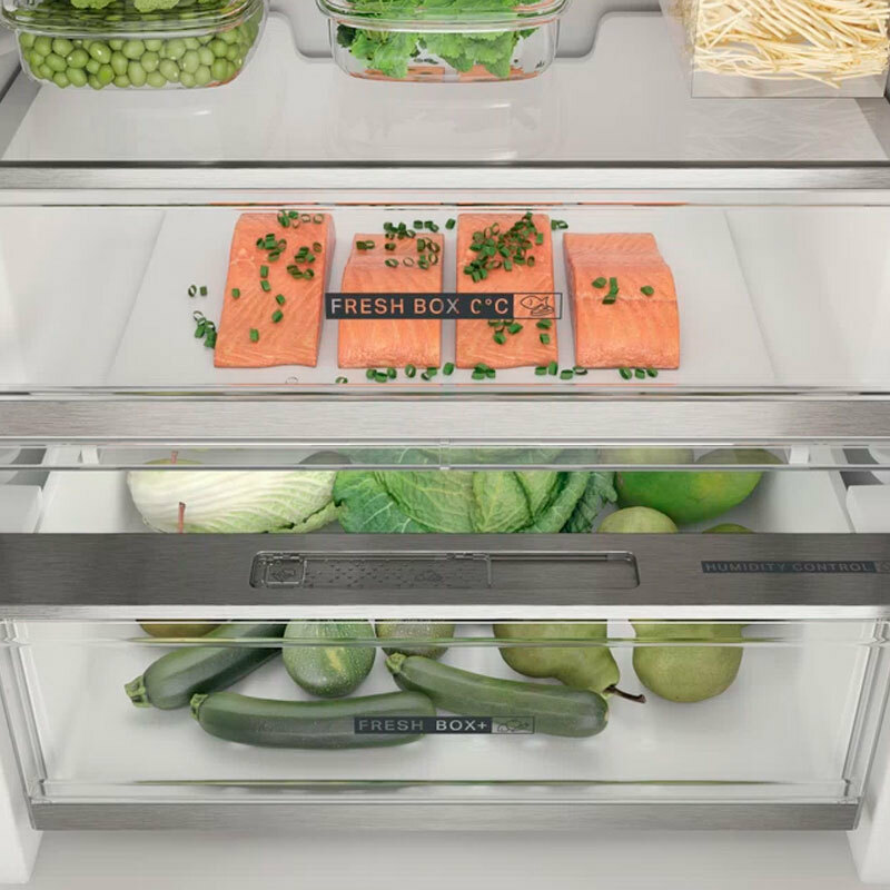 *Fresh Box+: Las frutas y verduras se mantienen frescas hasta 15 días. Un cajón con control deslizante de control de humedad integrado que le permite mantener sus frutas y verduras frescas hasta 15 días *Fresh Box 0º: Temperatura ideal en el cajón de 0° (-2°/+3°) para preservar la comida delicada como carne y pescado. *6th Sense: Las mejores condiciones de conservación siempre están garantizadas gracias a la tecnología 6TH SENSE que detecta cualquier fluctuación de temperatura causada por factores externos y restaura rápidamente el nivel ideal, tanto en la nevera como en el congelador. *Cool Breeze: El almacenamiento se vuelve libre de pensamientos gracias a la tecnología Cool Breeze. La circulación uniforme del aire garantiza una temperatura homogénea en todos los estantes, lo que permite una organización más intuitiva de los alimentos, y también garantiza una temperatura estable de los alimentos para una conservación óptima.