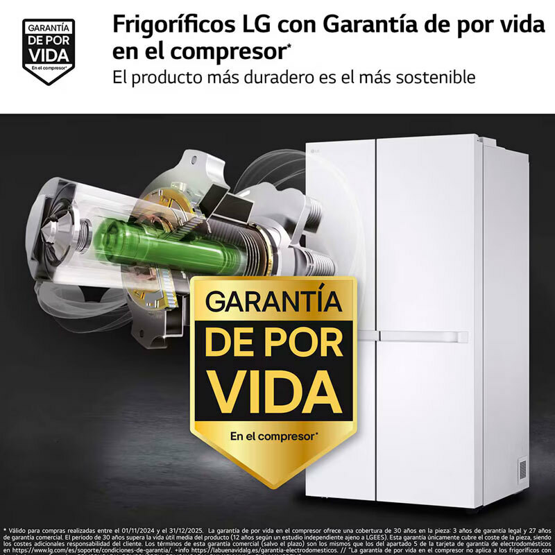 Linear Cooling: reduce las fluctuaciones de temperatura, conservando tus alimentos frescos pasados 7 días. - Inverter Linear Compressor 10 años de garantía. El compresor Inverter Linear Compressor de LG está formado por menos componentes por lo que produce menos ruido que un compresor convencional. Además, ahorra más energía y proporciona mayor durabilidad. - (1) SI INCLUYE LA RETIRADA DEL APARATO VIEJO SI SE SOLICITA - NO INCLUYE EL USO DE MEDIOS ADICIONALES A LA ENTREGA (grúas, vehículos especiales,...)