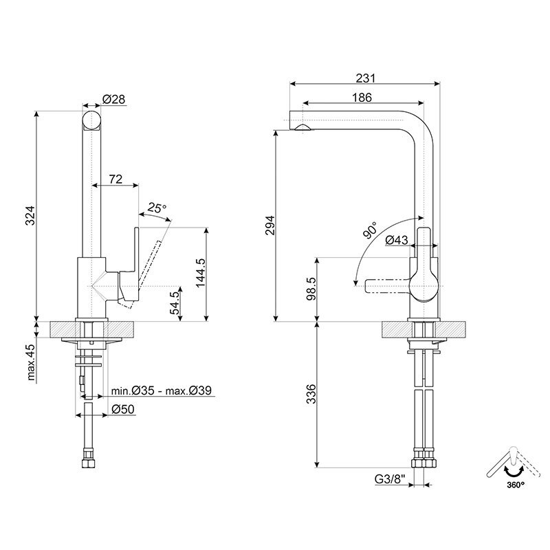 Presión máxima: 5 bar - Presión mínima: 1 bar - Presión óptima: 3 bar - Diámetro del orificio del grifo: 35 mm