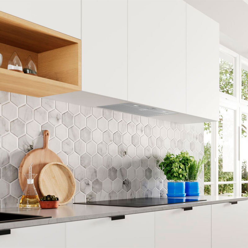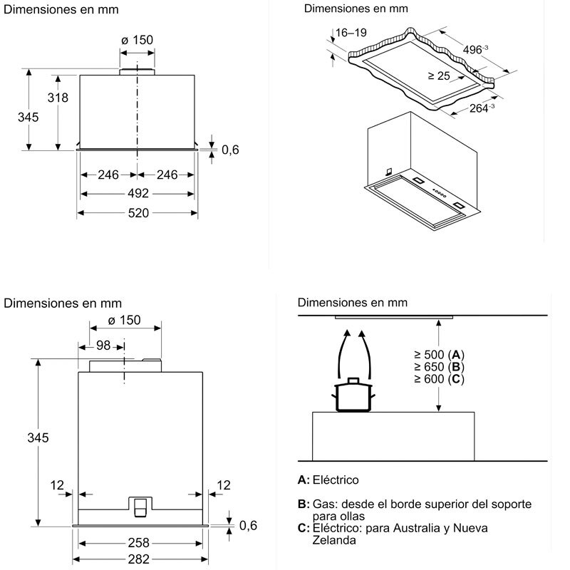 Temperatura del color: 4000 K Intensidad de la luz: 400 lux Restablecimiento automático de la posición intensiva a la normal después de 6 min Montaje en armario alto Instalación enrasada para una perfecta integración en armarios de cocina. Posibilidad de instalarse en recirulación o con salida al exterior Para instalar la campana en recirculación se disponen de varios accesorios opcionales.