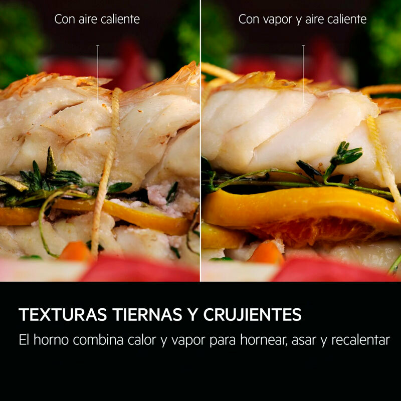*SteamCrisp® deja los ingredientes crujientes por fuera y jugosos por dentro: Los hornos multifunción con tecnología SteamCrisp® combinan calor convencional con vapor para hornear, asar y regenerar alimentos. Esta combinación mantiene los platos crujientes por fuera y jugosos por dentro: la carne es más jugosa y el pescado es hasta un 20% más tierno en comparación con un horno sin vapor. *CookSmart Touch. Cocina inteligente al alcance de tus dedos: La pantalla CookSmart Touch con navegación por deslizamiento te permite recibir consejos de cocina y seleccionar funciones del horno. Y con consejos para ahorrar energía, puedes cocinar de manera más eficiente. Tus platos y métodos favoritos se pueden guardar en la aplicación y enviar al horno con solo tocar un botón. *Deja que la IA transforme tus recetas con vapor: TasteAssist IA transforma las recetas tradicionales adaptándolas a las funciones de vapor. Simplemente envía una receta web a tu horno a través de nuestra aplicación y deja que la IA optimice el tiempo, la temperatura y la función, ayudándote a crear recetas más nutritivas y deliciosas consumiendo menos energía. *Cocción Asistida, ayuda extra al cocinar: Con su pantalla de gran tamaño, la función de Cocción Asistida te da acceso intuitivo a una amplia gama de platos donde el horno ajusta automáticamente las funciones de cocción dependiendo de cada caso. El tiempo y la temperatura pueden ser controlados completamente por ti. *Limpieza pirolítica. La función de autolimpieza: Con altas temperaturas, la función de limpieza pirolítica convierte la grasa y los residuos de comida en ceniza, para que puedas limpiar el horno fácilmente con un paño húmedo.