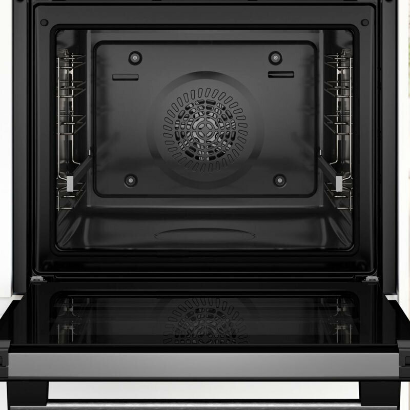 Raíles: Guía telescópica en 1 nivel, con stopSecurity Interior Black Diamond Autolimpieza pirolítica con 3 niveles de intensidad Asistente de limpieza con agua Reloj electrónico programable de inicio y paro de cocción Función Sprint de precalentamiento rápido Iluminación halógena en el interior del horno Recipiente para cocinado con vapor 250 ml Indicación de estado de calentamiento del horno Baja temperatura de la puerta durante la pirólisis Autodesconexión de seguridad
