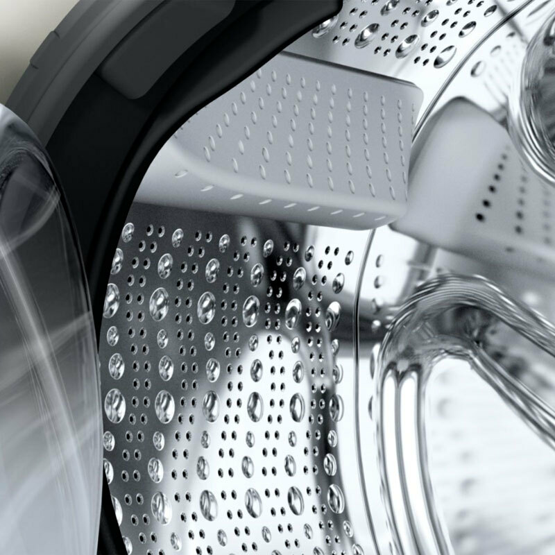 Reducción de ruido. Sistema automático de distribución de ropa: Sensor 3G y Paneles laterales antivibración. - Indicación de tiempo restante, estado de programa y fin diferido hasta 24 h. - Cuidado de la ropa: Tambor VarioSoft con palas asimétricas. - Cubeta de detergente autolimpiante. - Protección múltiple de agua. - Bloqueo de seguridad para niños. - Posibilidad de instalación bajo encimera en muebles de altura 85 cm o más
