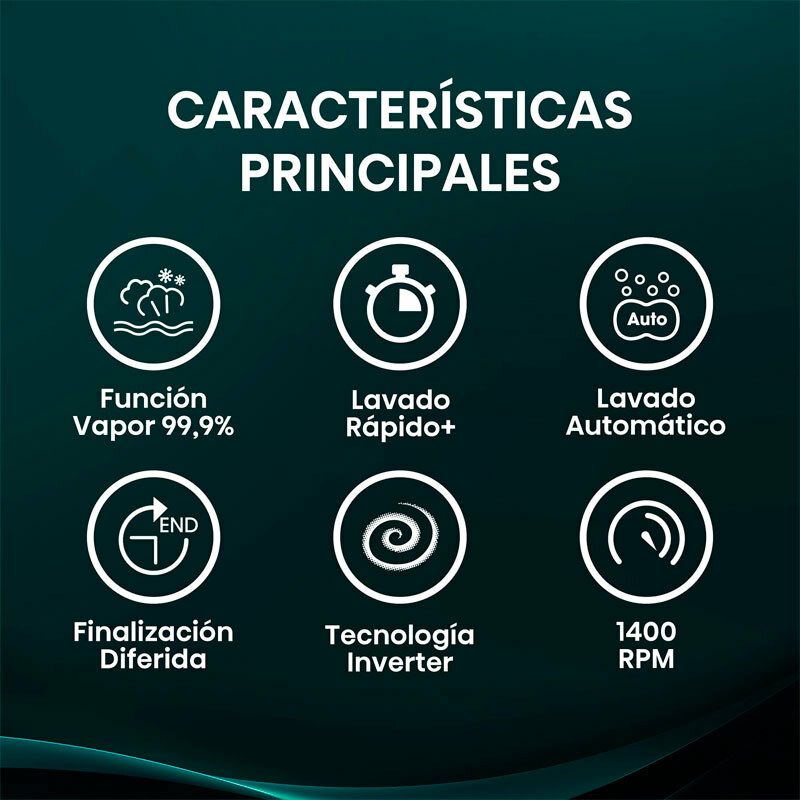 Lavado Rápido+ Reduce el tiempo y coste de lavado, ofreciendo múltiples programas de lavado rápido para satisfacer tus necesidades personalizadas. - Lavado Automático Sensores inteligentes ajustan automáticamente el programa de lavado y añade la cantidad adecuada de agua y detergente para una limpieza óptima y eficiente. - Tecnología Inverter Asegura larga durabilidad y mayor ahorro energético con un funcionamiento que minimiza ruido y vibraciones. - Limpieza de Tambor Un lavado rápido a alta temperatura combinado con un centrifugado rápido eliminan las bacterias y el moho que causan el mal olor en la lavadora. - Bloqueo Infantil Crea un entorno seguro para los niños, impidiendo que puedan detener o iniciar la lavadora.