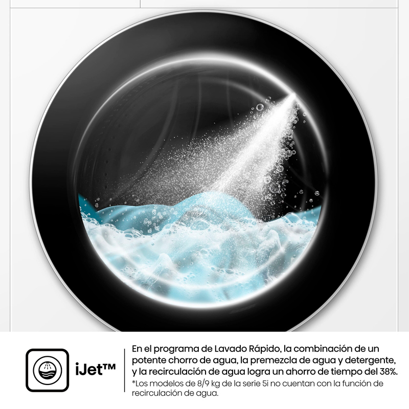 iJet™ En el programa de Lavado Rápido, la combinación de un potente chorro de agua, la premezcla de agua y detergente, y la recirculación de agua logra un ahorro de tiempo del 38%. - Los modelos de 8/9 kg de la serie 5i no cuentan con la función de recirculación de agua. - Lavado y Secado 49’ La solución perfecta para el lavado diario permite Lavar y Secar en tan solo 49 min. - Programa Especial Mascotas Elimina eficazmente el pelo de mascota de tu ropa mientras usa vapor para esterilizar y eliminar ácaros. - Puerta de Cristal Diseñada para durar y lucir genial. Combina resistencia al impacto con una amplia y clara visibilidad de todo el interior durante el ciclo de lavado. - Iluminación Interior Tras completar el ciclo, la luz del tambor permanece encendida para recordarte retirar la ropa. Incluso si la máquina está apagada, la luz se mantiene al abrir la puerta. - Función Antiarrugas Utiliza vapor suave y rotación del tambor para reducir las arrugas, haciendo innecesario el planchado. Tu ropa sale más lisa, ahorrándote tiempo y esfuerzo mientras mantiene los tejidos frescos. - Conectividad Wifi Permite programar a distancia, revisar el ahorro energético y recibir notificaciones directamente en el teléfono. - Lavado en Frío El programa de Lavado en Frío logra los mismos resultados que un lavado en caliente, ahorrando hasta un 71% de energía. Suave con tu ropa y el medio ambiente. - Comparación del consumo de energía de una carga media, programa de Algodón a 40 con y sin la opción de Lavado en Frío activada. - Eco Refresh Revitaliza rápidamente tu ropa eliminando las arrugas con poca agua. Perfecto para tejidos que necesitan un refresco rápido, ahorra hasta un 96% más de agua comparado con ciclos tradicionales. - Ropa de Cama Protege tus sábanas con un lavado delicado pero eficaz y completo protegiendo los tejidos.