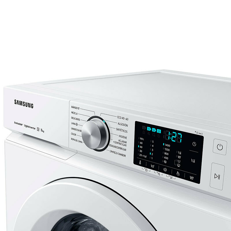 *Diseño BESPOKE con tecnología SpaceMax. Hasta 11kg de espacio interior manteniendo el mismo tamaño exterior de una lavadora estándar. Se alinea perfectamente con tu cocina y, su diseño interior está optimizado gracias a la tecnología SpaceMax, que te permite aprovechar al máximo el espacio del tambor sin aumentarlas dimensiones externas. *Programas de vapor: Elimina los alérgenos y bacterias en un 99,9% a través de una fase de vapor al final del ciclo del lavado principal. Disponible en Programa Higiene (mínimo 60ºC) y Ropa de Cama (máximo 40ºC) *Prelavado Burbujas: Tus prendas permanecen en remojo intenso de burbujas antes del ciclo de lavado para eliminar las manchas con más facilidad y que el lavado sea más eficaz.