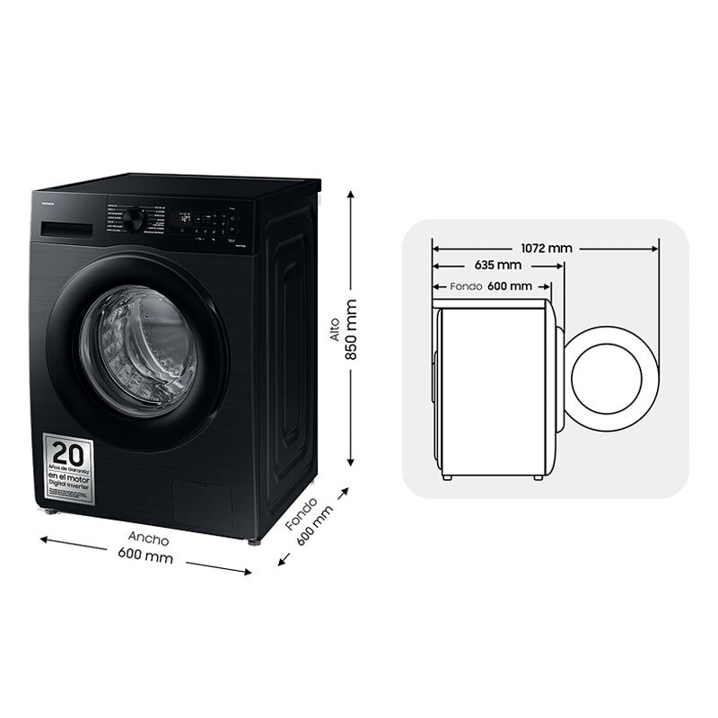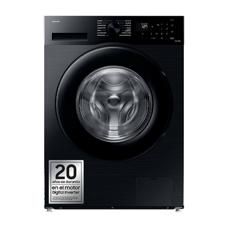 *Lavadora carga Frontal - ¡¡WiFi - SmartThings AI Energy Mode!! *¡¡EcoBubble!! - Color Negro - Centrifugado 1.400 r.p.m. *¡¡Programa Higiene Vapor!! - Capacidad 8 kg - ¡¡Clase energética A!! *¡¡Inteligencia artificial!! *¡¡Wifi integrado!! *¡¡SmartThings AI Energy Mode!! *¡¡Tecnología EcoBubble!! es la tecnología exclusiva de Samsung que disuelve el detergente incluso en agua fría (15º), logrando excelentes resultados *{¡¡Motor digital inverter con 20 años de garantía!!} *Display LED *¡¡Programas de vapor:!! Elimina los alérgenos y bacterias en un 99,9% a través de una fase de vapor al final del ciclo del lavado principal *¡¡Lavado de Tambor+!! *Programas: Eco 40-60 - Quick Wash 15’ - Ropa de cama - Algodón - Colore - Limpieza de bidones - Delicados - Limpieza de Vapo - Lavado Frío Intenso - Less Microfiber - Carga mixta - Centrifugado + Aclarad - Sintéticos - Lana/Delicados *Planchado fácil *Bloqueo Infantil *Final Diferido *Tipo de tambor: 2nd Diamond *Puerta: Color negro *Cubeta autolimpiable *Consumo energía anual por 100 ciclos: 47 kWh/100 ciclos *Consumo de agua por ciclo: 48 L *Nivel sonoro centrifugado: 72 dB *Dimensiones del aparato (alto x ancho x fondo): 850 x 600 x 635 mm