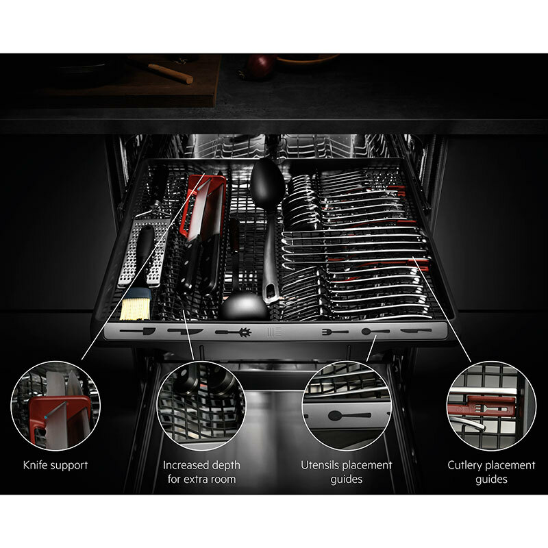 Desconexión automática AutoOff - Tecnología bitérmica termoeficiente - Indicadores de sal y abrillantador - Pilotos: Rinse aid, Sal, Alarma acústica, Inicio diferido 3h, «Beam on Floor» dos colores, Xtra Silent - Bisagras: Deslizantes PerfectFit