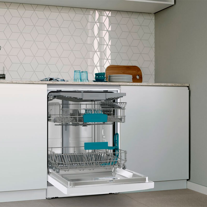 Tercera bandeja - Cesta superior RackMatic regulable en 3 alturas - Cesta inferior con sistema de extracción de fácil deslizamiento y freno de seguridad - Varillas abatibles cesta superior/inferior: 2/4 - Bandeja dosificadora de detergente