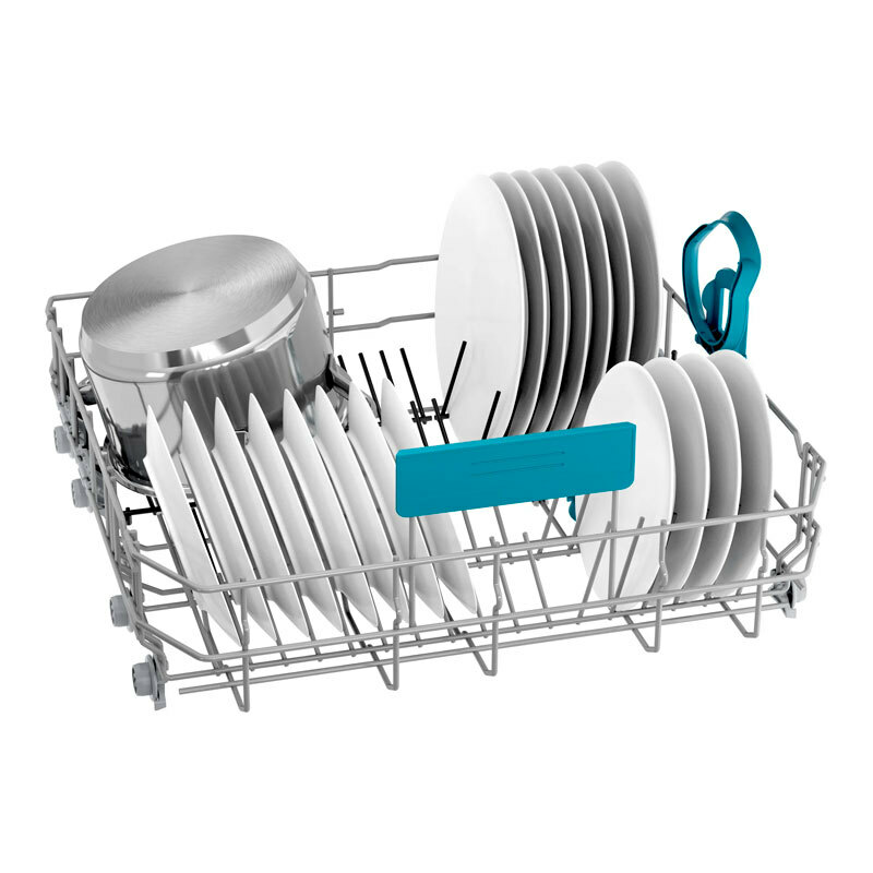 Tercera bandeja para cubiertos y utensilios Cesta superior RackMatic regulable en 3 alturas Cesta inferior con sistema de extracción de fácil deslizamiento y freno de seguridad Varillas abatibles cesta superior/inferior: 2/4