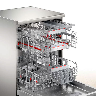 ["Tercera bandeja","Cesta superior RackMatic 2 niveles","Freno en cesta inferior evitando posibles descarrilamientos","Varillas abatibles","Cestillo para cubiertos","Zona ExtraClean: limpieza intensiva hasta de la suciedad más resistente","Bandeja dosificadora de detergentes combinados"]