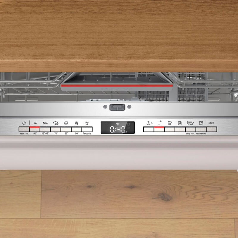 Función Extra Secado: Aún más seco. La vajilla, en ocasiones, puede no estar totalmente seca tras el ciclo de lavado. Por ello, los lavavajillas de Bosch ofrecen una función especial: Extra Secado. Eleva la temperatura del aclarado final y extiende la fase de secado. De este modo, incluso lavajilla de material plástico como biberones o utensilios para picnic terminan perfectamente limpios y secos. - Calidad de higiene probada Máxima higiene certificada. Los virus como el COVID o la gripe son eliminados de manera eficaz y eficiente con el programa Eco a 50°C, probado por el Instituto de Higiene y Virología Integrativa (Etiqueta de Higiene Nivel 1). Cuanto más alta sea la temperatura, más altos serán los niveles de higiene para aquellso virus más resistentes, incluyendo virus envueltos y no. Esto ha sido confirmado para el programa Intensivo a 70°C y el de Limpieza de la cuba (Etiqueta de Higiene Nivel 3). - Silence Plus 42 dB Un lavavajillas silencioso. Si te gusta disfrutar del silencio también en la cocina, el lavavajillas Silence Plus 42 dB es para ti. Tiene un funcionamiento sigiloso para que puedas ponerlo a cualquier hora. - Descarga de programas Descarga programas que se adaptan a tu día a día. Los programas del lavavajillas no siempre se adaptan a tus necesidades específicas. Por eso, en los lavavajillas Bosch compatibles, puedes bajarte programas adicionales mediante la aplicación Home Connect. Gracias a los programas que se adaptan a ti, esta función te garantiza unos resultados perfectos en todo momento. - Asistente de Programas El programa perfecto. Es difícil estar seguro de qué programa elegir. El Asistente de Programas lo hace fácil. Con solo un par de preguntas en la app Home Connect acerca del tipo de vajilla, nivel de suciedad y preferencias (ahorro de enegía, secado, rapidez y silencio), el Asistente te recomendará el programa que más se adapte. Solo tendrás que confirmar y el trabajo está hecho. - Diagnóstico remoto Asistencia remota en caso de avería. Las averías de los electrodomésticos suelen producirse en los momentos más inoportunos. El diagnóstico remoto te ayuda a resolver antes los problemas. Solo tienes que contactar con el servicio de atención al cliente de Bosch y, con tu permiso, accederán a distancia al electrodoméstico para localizar el problema y ayudarte a solucionarlo. Si el problema no se puede solucionar a distancia, avisaremos a un técnico de servicio de Bosch, que acudirá a tu domicilio con las piezas y todo lo necesario para resolverlo lo antes posible. Soluciones inteligentes para una asistencia inteligente. - Notificaciones en tu dispositivo móvil Si lo deseas podrás recibir notificaciones automáticas en tu dispositivo móvil. De esta forma siempre estarás informado de la actividad de tu lavavajillas. Podrás encenderlo desde cualquier sitio, seguir la progresión del programa, te avisará cuando éste haya terminado, y te informará cuando sea necesario reponer la sal o el abrillantado. Incluso, de las pastillas que quedan. - InfoLightBusca el punto rojo. InfoLight consiste en una proyección de luz LED roja en el suelo de tu cocina que te informa si tu lavavajillas totalmente integrable continúa en funcionamiento. Sabrás que el programa ha finalizado porque la luz que se proyecta desaparece. - AquaStop Tu lavavajillas no volverá a perder agua. Un buen lavavajillas nunca debería perder agua, por eso nuestro sistema AquaStop te ofrece la máxima protección. Cuando el sensor detecta una fuga, el lavavajillas deja de funcionar automáticamente y extrae el agua para evitar daños. Este sistema está garantizado durante toda la vida útil del electrodoméstico. - Tecnología ActiveWater Menos agua, menos energía y más rendimiento. Esta innovadora tecnología maximiza la eficiencia y garantiza un aclarado respetuoso con el medio ambiente para obtener resultados de limpieza excelentes. Se ahorra agua y energía con una distribución eficaz del agua, una tecnología de filtrado optimizada, un calentamiento más rápido y una mayor potencia que incrementa la frecuencia de circulación de agua. - Motor EcoSilence Silencioso, potente, eficaz y duradero. El motor EcoSilence, que prescinde de las tradicionales escobillas de grafito, es silencioso, eficaz, robusto y duradero. Además, garantiza un mínimo consumo energético y un mínimo nivel de ruido. - 10 años de garantía Nuestros lavavajillas han sido creados para durar. La alta calidad de los materiales utilizados en su fabricación y las pruebas de estanqueidad de la cuba son la prueba de que nuestros lavavajillas han sido creados para durar, durar y durar. Te ofrecemos una garantía de 10 años en la cuba de nuestros lavavajillas frente a oxidación y corrosión de la cuba. Las condiciones detalladas de la garantía vienen especificadas en nuestra página web. - Dosificador de detergente Para una perfecta disolución de la pastilla. El dosificador automático de detergente garantiza los mejores resultados de limpieza y un lavado más silencioso. Durante el lavado, la pastilla del detergente cae en la bandeja dosificadora situada en la cesta superior, donde es rociada de agua constantemente tanto por los brazos aspersores como por la ducha superior. De esta forma se evita que la pastilla caiga sobre la cuba sin disolverse y se asegura que recibe un remojado continuo asegurando una perfecta disolución. -