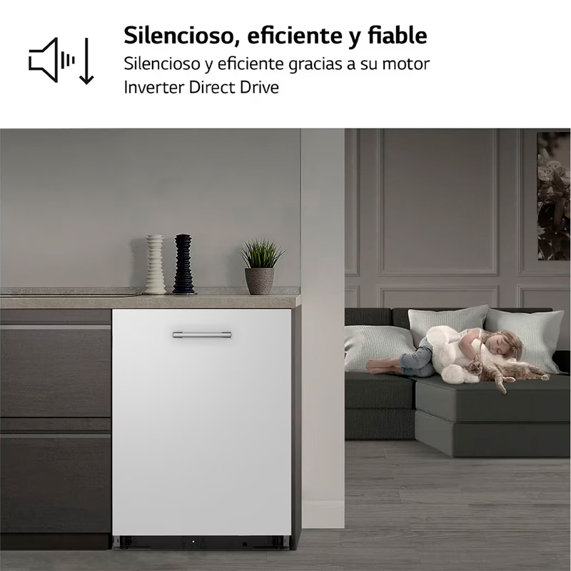 Desincrusta la suciedad y reduce las marcas de agua Gracias al vapor de la tecnología TrueSteam - Limpieza en todos los rincones Gracias a los 4 brazos multi-movimiento de la tecnología QuadWash - Conectado para hacerte la vida más fácil Descarga programas adicionales a través de la app ThinQ - TrueSteam™ Desincrusta la suciedad en tu vajilla El vapor de la tecnología TrueSteamTM generado a 100ºC desincrusta la suciedad, consigue mayor higiene y reduce las marcas de agua, dejando tu vajilla impoluta. - Ahorra tiempo sin prelavado TrueSteam™ elimina hasta la suciedad más incrustada gracias al vapor - Vapor en todos los rincones El vapor de la tecnología TrueSteamTM llega a todos los rincones para cuidad de toda tu vajilla - Menos marcas de agua El vapor deja los platos relucientes y reduce las marcas de agua en un 30% - QuadWash™ Limpieza completa desde todos los ángulos. QuadWash™ utiliza 4 brazos multi-movimiento que consiguen llegar a todos los rincones para una limpieza completa. Además, gracias a DuaZone, puedes elegir entre distintos niveles de presión entre la bandeja inferior y las superiores. - Limpieza y cuidado de tu vajilla Selecciona intensidad fuerte en la parte inferior para lavar ollas y sartenes e intensidad suave en la parte superior para lavar tu cristalería más delicada al mismo tiempo. - EasyRack™Plus Hasta 112 combinaciones distintas para colocar tu vajilla. El sistema EasyRackTM Plus cuenta con 3ª bandeja para cubiertos, bandejas ajustables en altura y parrillas abatibles. Así podrás adaptar la posición de las bandejas al tamaño de la vajilla en cada momento. - 3ª bandeja para cubiertos Más espacio para objetos difíciles de colocar, desde cubiertos largos hasta pequeñas tazas de café expreso - Rejilla lateral plegable Se adapta a tus necesidades - 20% más eficiente que A El motor Inverter DD ha sido diseñado para mejorar la eficiencia energética hasta en un 54%1) y alcanzar la máxima calificación energética A según las normas de eficiencia energética de la UE. - LG ThinQ™ Conectado para hacerte la vida más fácil. Te avisa cuando el ciclo de lavado ha terminado a través de la app LG ThinQ - Más opciones de lavado a tu alcance Descarga programas adicionales a través de la app ThinQTM: especial ollas y sartenes, cristalería... - Lava tu vajilla a tu manera Personaliza las opciones de tu lavavajillas a través de la app ThinQ - Silencioso, eficiente y fiable El motor Inverter Direct Drive™ controla la circulación del agua y la intensidad del spray consiguiendo un rendimiento duradero, versátil y silencioso.