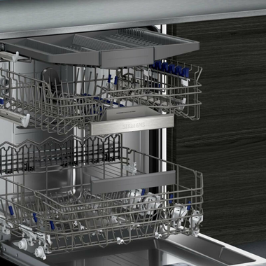 3ª bandeja varioDrawer - Cesta superior rackMatic regulable en 3 alturas - Sistema de deslizamiento avanzado en cesta superior - Freno en cesta inferior evitando posibles descarrilamientos - Varillas abatibles - Motor iQdrive - Accesorio para copas incluido