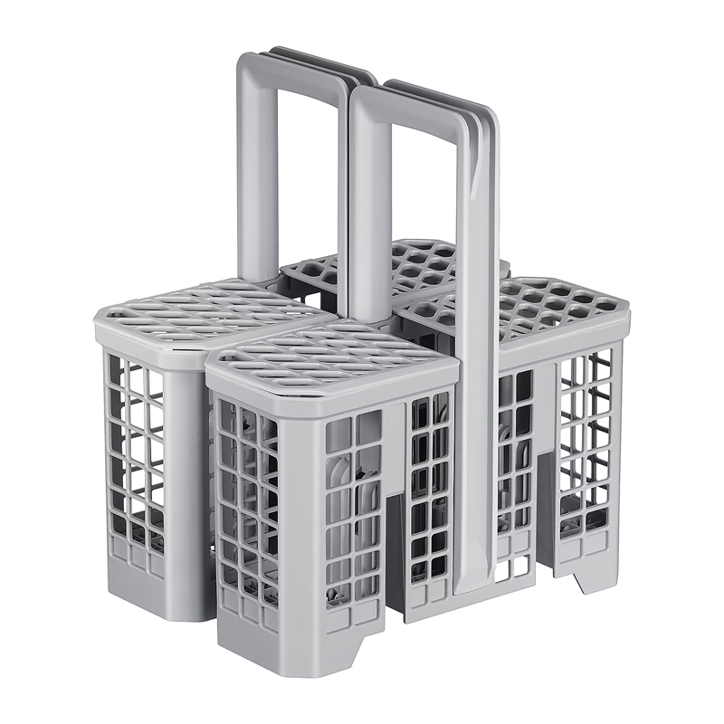 Cesta superior: Tirador en cesta - Estante plegables - Estante para cuchillos - Altura Ajustable - Púas de guía de carga flexible Cesta inferior: Tirador en cesta - Dientes plegables Cesto para cubiertos
