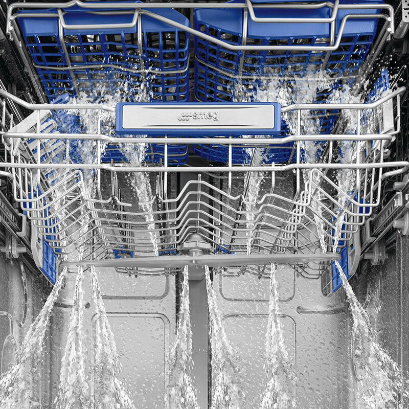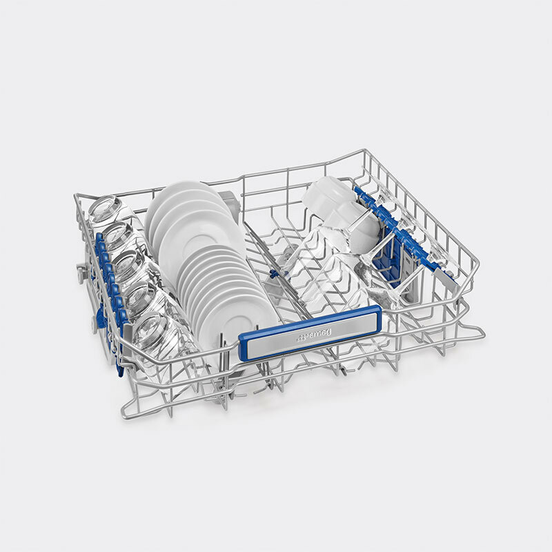 Sistema de lavado planetario: El dispositivo, compuesto por un soporte circular y un brazo rociador doble de alta velocidad y movimiento simultáneo, hace que el agua llegue a todos los puntos de la cavidad, garantizando excelentes resultados de lavado y un bajo consumo de agua. - Limpieza global: Sistema de Lavado Planetario El sistema de lavado Planetario, patentado por Smeg, asegura una cobertura de lavado máxima dentro del lavavajillas mediante un innovador movimiento de simulación doble del brazo rociador. Aunque la ingeniería es compleja, el resultado es simple: ¡platos brillantes cada vez sin dejar ningún rincón sin limpiar! - Diferentes espacios para distintas necesidades culinarias La flexibilidad del cesto superior ofrece tres opciones de altura ajustable. Esta adaptabilidad garantiza que cada tipo de vajilla, desde vasos altos hasta ollas grandes y copas delicadas, reciba una limpieza e higiene óptimas. - Ni una sola gota desperdiciada Los inserts anti-goteo de color azul están instalados en el cesto inferior de los lavavajillas de nueva generación de Smeg. Esta adición mejora los resultados de secado y reduce las gotas entre los platos y el cesto.