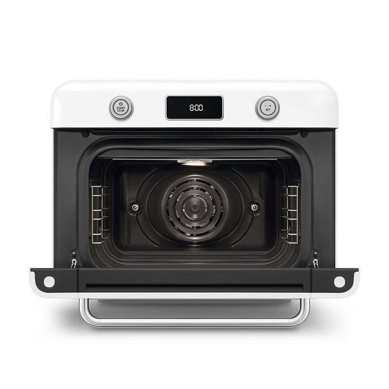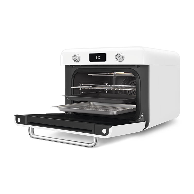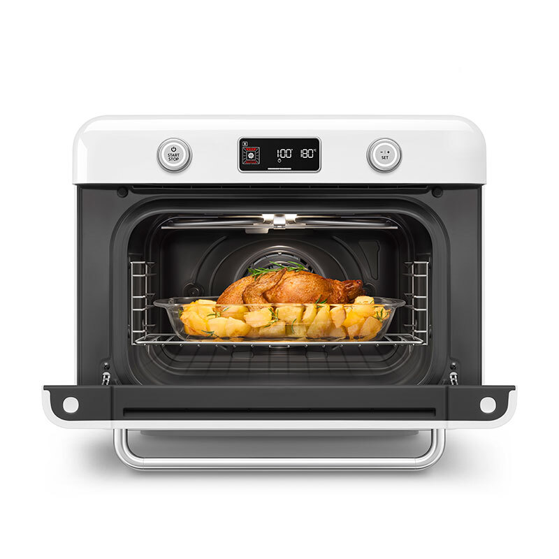 Tecnología Galileo Multicooking Nuestra innovadora tecnología combina un nuevo interior con un flujo de aire mejorado junto con la capacidad de mezclar múltiples técnicas de cocción, proporcionando resultados excepcionales en un diseño compacto y versátil. - Menú Tradicional Prepara platos gourmet fácilmente en casa. Ideal para cocinar carnes asadas, pan, tartas, pasteles, galletas y pizzas. - Menú Vapor El vapor permite preservar las propiedades nutricionales sin comprometer el sabor. Ideal para pasta, pescado, verduras, pollo, arroz y postres. - Menú Chef Eleva tu cocina con preparaciones inspiradas por chefs. Sumérgete en una selección de 33 opciones gourmet y personaliza las cantidades de ingredientes. Nuestro sistema intuitivo asegura resultados de cocción perfectos automáticamente. - 10 en 1: ¡Descubre una forma nueva y emocionante de cocinar que combina lo mejor de la tradición y la innovación moderna! Tienes diez maneras diferentes de preparar platos deliciosos: Funciones tradicionales del horno: hornear, cocción por convección, gratinar, calor inferior, freír con aire, calentar y descongelar. Funciones de cocción al vapor: vapor puro, combinación de convección y vapor, combinación de gratinado y vapor. - 33 recetas pre-establecidas Navega por el Menú del Chef para encontrar inspiración y orientación adicionales. Al seleccionar el tipo y el peso de los alimentos, el horno configurará automáticamente la combinación más adecuada de función, tiempo y temperatura. - My Smeg Assistant Descubre todo sobre el producto en tu móvil simplemente escaneando el código QR dentro del depósito de agua.