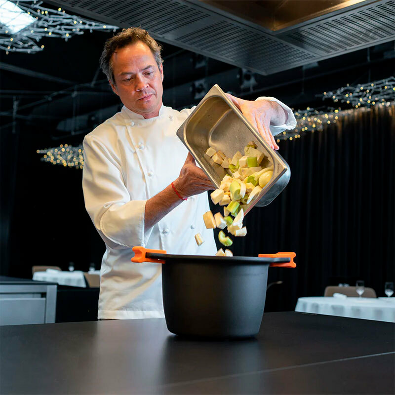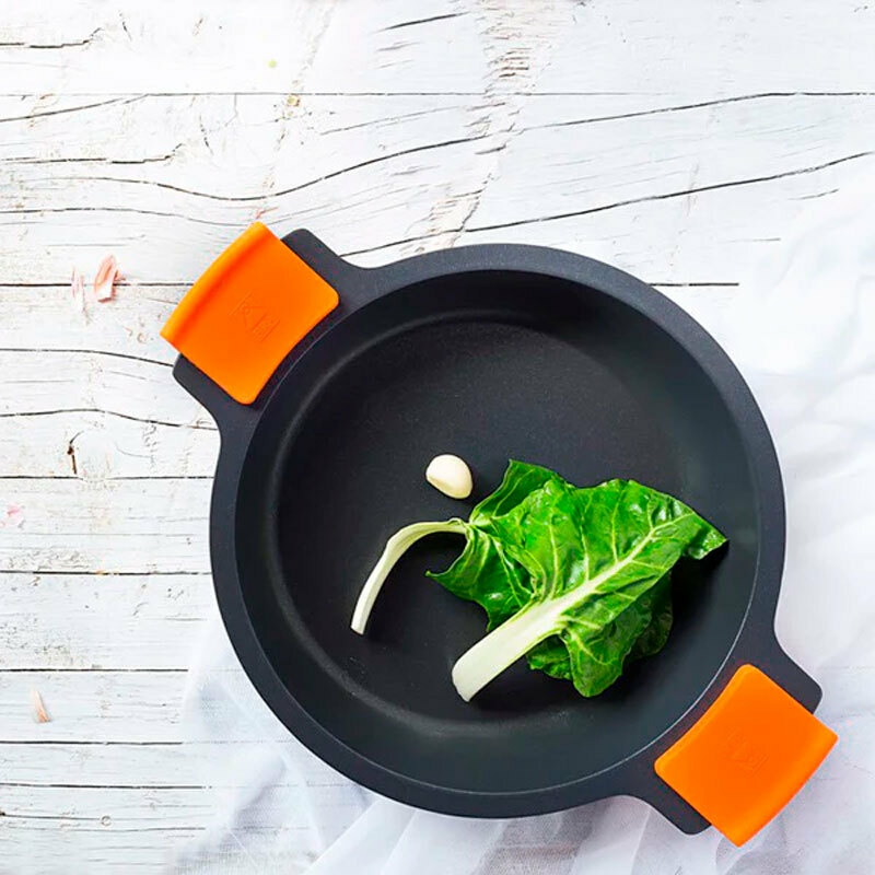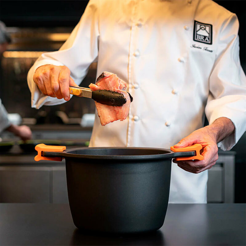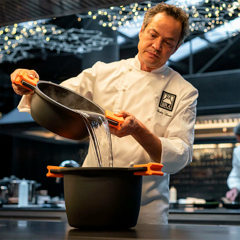 La olla alta Efficient reúne la eficacia y la calidad para un uso de cocina intensiva con los mejores resultados. Es una olla robusta y duradera gracias a su cuerpo fabricado en aluminio fundido y a la calidad de su antiadherente Platinum Plus libre de PFOA.*Es apta para todas las fuentes de calor (incluida la inducción) gracias a su fondo difusor full induction. Además tiene un excelente reparto de la temperatura para una cocción perfecta de todas nuestras recetas. *Incluye dos asas de silicona en color naranja para coger la olla con comodidad. *La olla alta Efficient es perfecta para preparar todo tipo de guisos, caldos y cremas vegetales o de legumbres, tanto en el fuego como en el horno. Su excelente reparto del calor y su tapa transparente, que mantiene la temperatura y el vapor de la cocción y permiten controlar la cocción sin levantarla, contribuyen a reducir los tiempos de cocción. Es perfecta para cocer todo tipo de pasta larga y corta, para las verduras cortadas o bien las piezas enteras, o para las legumbres. Es una olla ideal para preparar guisos que requieran cocinarse a fuego bajo, como el gulash, unas habas estofadas, unas tiras de costilla de cerdo confitadas o unas alcachofas prepararas de esta misma manera. Su excelente reparto del calor hace que sea ideal para preparar una rica sopa castellana o una de cebolla, pudiendo darle el gratinado final en el horno sin tener que cambiarla de recipiente. En ambos tamaños es una olla práctica y muy funcional, con gran capacidad, perfecta para cocinar de forma eficiente y muy fácil de limpiar