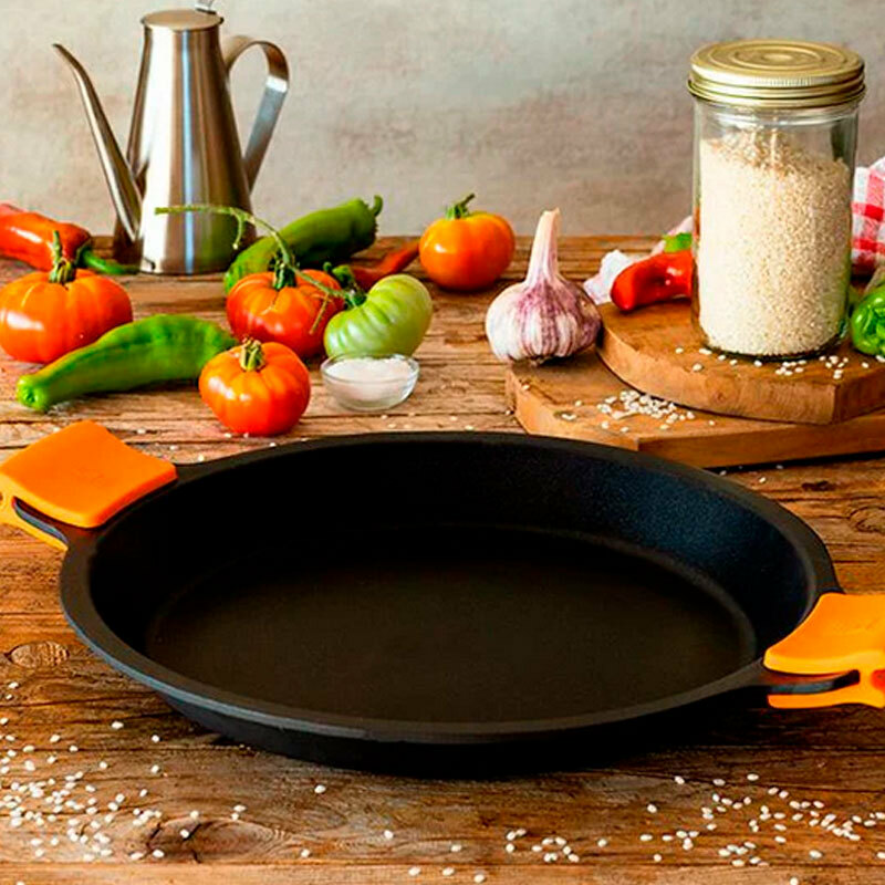 *La paellera Efficient reúne la eficacia y la calidad para un uso de cocina intensiva con los mejores resultados. Es una paellera robusta y duradera gracias a su cuerpo fabricado en aluminio fundido y a la calidad de su antiadherente Platinum Plus libre de PFOA. *Es apta para todas las fuentes de calor (incluida la inducción) gracias a su fondo difusor full induction. Además tiene un excelente reparto de la temperatura para una cocción perfecta de todas nuestras recetas. *Incluye dos asas de silicona en color naranja para coger la paellera con comodidad. *Es una paellera ideal no solo para preparar todo tipo de paellas y fideuás. Desde una tradicional y sabrosa paella valenciana, un arroz negro con guisantes y sepia, un arroz del señorito o una deliciosa fideuá con su perfecto acabado en el horno. Su gran superficie antiadherente te permite también utilizarla como plancha para cocinar de forma rápida y limpia, y sin apenas aceite, cualquier verdura, el pescado de la cena o la carne de la comida para toda la familia. Los filetes de merluza o de dorada, unas rodajas de rape o de bonito, una sepia o unos calamarcitos con ajo y perejil, o unos mejillones quedarán en su punto. Del mismo modo que lo hará cualquier carne que quieras preparar a la plancha: un poco de lomo con sal y pimienta, una pechuga de pollo espolvoreada con una pizca de tomillo o un entrecot de ternera con un toque de mostaza justo antes de servirlo en el plato. Y al ser apta para el horno, te permite asar unas piezas de pollo con patatas panadera sazonadas con tus aromáticas preferidas, hornear cualquier pescado con unas verduras para tener un plato de lo más completo e incluso cocinar una deliciosa tarta de hojaldre y manzana o una empanada de atún y pimientos. Gracias a su antiadherente, podrás cocinar cualquier alimento con muy poco aceite y sin que se pegue nada, de una forma muy eficiente. Y además resulta muy fácil y cómoda de limpiar.