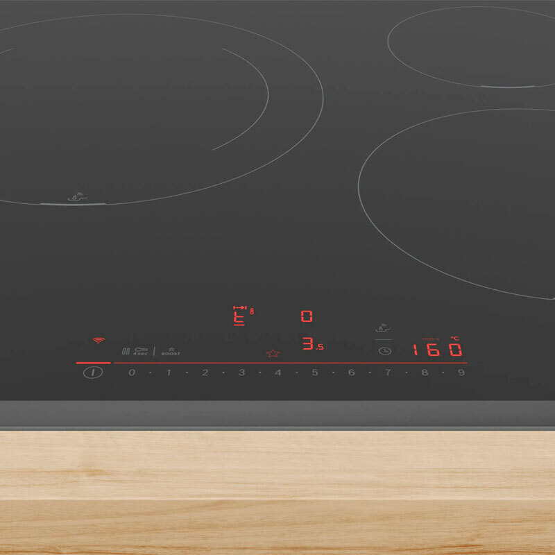 *¡¡Home connect:!! Home Connect, controla tu placa desde un dispositivo móvil. *¡¡Direct Select:!! ¿A veces te pierdes con los ajustes de la placa de cocción? Con DirectSelect no te pasará, porque puedes seleccionar las zonas de cocción y ajustar la potencia de forma directa, rápida y sencilla mediante el intuitivo panel de control y la tira luminosa indicadora. *¡¡PerfectFry Plus:!! Ahora es más fácil que nunca con PerfectFry Plus. Permite regular automáticamente la temperatura perfecta para todas tus recetas. Solo tienes que elegir el plato en una de nuestras aplicaciones de recetas o preguntarle a Alexa la temperatura adecuada. La temperatura seleccionada se enviará a la placa y podrás empezar a cocinar de inmediato. Gracias a su avanzada tecnología de sensores, controla automáticamente la temperatura de la sartén para que los alimentos queden en su punto y no se quemen. *¡¡Favorito:!! Las tareas rutinarias en la cocina, como cocer unos huevos duros perfectos en el tiempo justo, ahora son más fáciles que nunca. Con Favorito, puedes guardar tus ajustes preferidos, como el nivel de potencia y el tiempo de cocción. También podrás controlar la luz de la campana desde la placa. Solo tienes que vincular la placa de cocción a tu cuenta de Home Connect para cocinar de una manera más fácil. *¡¡Función de pausa:!! Por ejemplo, porque el bebé llora o llaman a la puerta o al teléfono. Con la función de pausa, puedes detener la cocción y bloquear la placa. Así puedes atender cualquier cosa que surja o limpiar la placa de cocción sin dejar el fuego encendido. Simplemente, continúa cocinando al cabo de 10 minutos o volviendo a pulsar sobre la función.