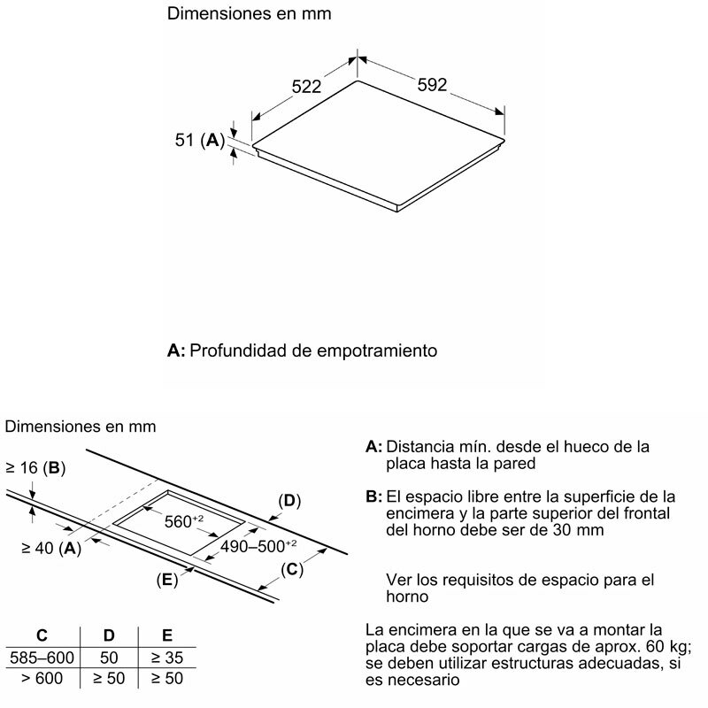 Encimera de espesor mínimo: 16 mm Potencia total de la placa limitable.