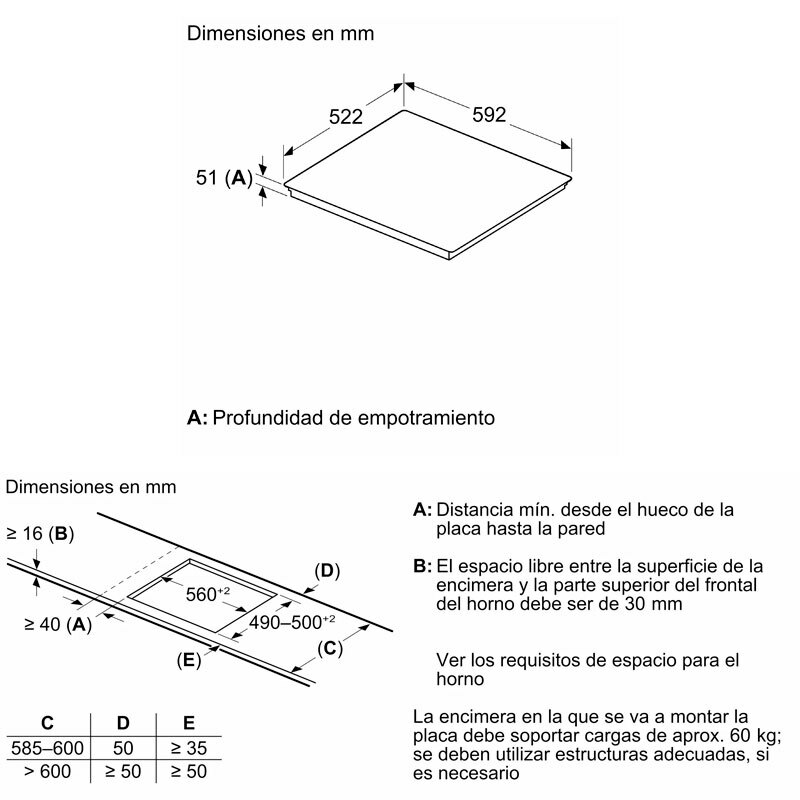 Encimera de espesor mínimo: 16 mm Potencia máxima: 7400 W Potencia total de la placa limitable.