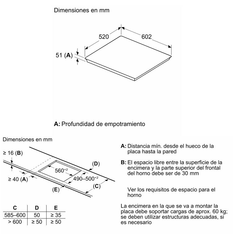 Potencia total de la placa limitable. Encimera de espesor mínimo: 16 mm