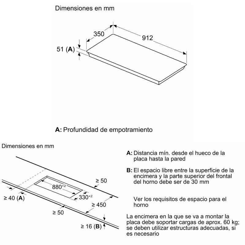 Autodesconexión de seguridad de la placa Encimera de espesor mínimo: 16 mm Potencia total de la placa limitable.