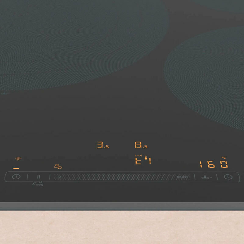 Control placa-campana: control de la campana desde la placa de inducción y AutoFuncionamiento de la campana en función del uso de la placa. Control remoto vía App Home Connect: Descarga de recetas adicionales, Diagnóstico remoto y Control por voz. Control de temperatura del aceite con 11 niveles en 2 zonas de cocción.