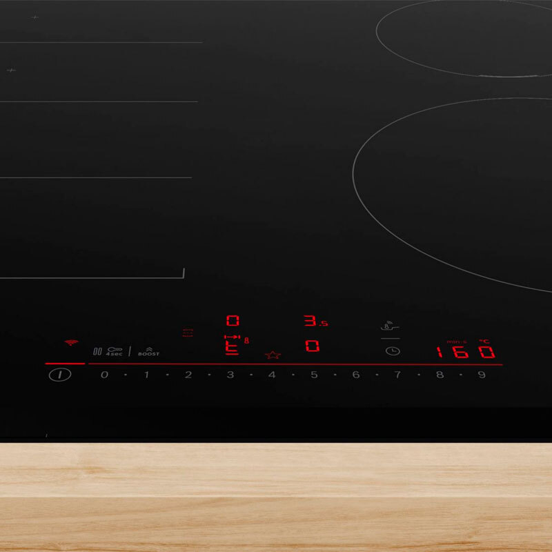 Control DirectSelect Cocina sin esfuerzo con un control intuitivo. ¿Quieres centrarte en tus recetas y no en aprender a usar el control de la placa? Para eso hemos creado el control DirectSelect. Selecciona las zonas de cocción y ajusta la potencia de forma directa, rápida y sencilla mediante el intuitivo panel de control DirectSelect. - FlexInducción La Zona FlexInducción se adapta al recipiente. Con la tecnología FlexInducción, puedes combinar dos zonas de cocción en una sola superficie de calentamiento uniforme. La placa detecta la posición y el tamaño de los recipientes y ajusta automáticamente la zona de cocción. Desde una cafetera hasta una fuente de asado, todos los recipientes se calientan de manera uniforme y eficiente. - PerfectFry Plus Temperatura del aceite siempre en su punto. El secreto para freír es mantener el aceite a la temperatura adecuada. Si está demasiado caliente, se quemará y estropeará tu plato. Con PerfectFry Plus, ya no tendrás que preocuparte por eso. El sensor PerfectFry Plus muestra y controla continuamente la temperatura de la sartén para evitar que se queme el aceite. Puedes elegir entre 11 temperaturas predeterminadas, de 70 a 220 ºC, para obtener resultados perfectos en todo tipo de platos. - Zonas FlexInducción Haz que tu placa de cocción se adapte a ti. Con las Zonas FlexInducción, puedes ajustar la superficie que usas de la placa sin tener que mover los recipientes. La placa detecta la posición y el tamaño de los recipientes y ajusta automáticamente la zona de cocción. Y si mueves las ollas o sartenes a otra parte de la placa, te preguntará si quieres transferir los ajustes de la zona de cocción automáticamente de la posición anterior a la nueva. ¡Así de fácil y cómodo! - Campana inteligente automática La forma más fácil de controlar la campana. Céntrate en cocinar y deja que la campana se regule sola. Nuestra campana inteligente se regula automáticamente, solo necesitas una placa de cocción conectada y tu cuenta de Home Connect. Un algoritmo regula la potencia de la campana en función de los ajustes de la placa de cocción. Así puedes cocinar sin olores ni vapores, y luego no tienes que limpiar las huellas de los dedos en la campana. Descubre la nueva forma fácil de cocinar. - Favorito ¡En tu placa mandas tú! Las tareas rutinarias en la cocina, como cocer unos huevos duros perfectos en el tiempo justo, ahora son más fáciles que nunca. Con Favorito, puedes guardar tus ajustes preferidos, como el nivel de potencia y el tiempo de cocción. También podrás controlar la luz de la campana desde la placa. Solo tienes que vincular la placa de cocción a tu cuenta de Home Connect para cocinar de una manera más fácil. - Asistente de la placa Los ajustes perfectos en tu placa con un solo toque. Ahora cocinar es más fácil que nunca con la Bosch BetterFood app. Sólo tienes que seguir paso a paso la receta y mandar los ajustes a tu placa conectada desde la app. Ya no es necesario pensar en qué nivel es más adecuado cocinar tu receta. Gracias al PerfectFry Plus y a la app, tendrás la temperatura precisa que tu plato necesita. Esta prestación inteligente hace tu vida más fácil, permitiéndote concentrarte en lo que realmente te gusta. - Función Sprint Cocina más rápido. Cuando tienes poco tiempo para cocinar, la función Sprint es tu mejor aliada. Esta práctica función añade un 50 % de potencia adicional a tu placa de inducción para calentar todo más rápido. Así puedes hervir grandes cantidades de agua y calentar tus alimentos casi un 35 % más rápido que a máxima potencia. - Función de pausa A veces necesitas hacer una pausa cuando cocinas. Por ejemplo, porque el bebé llora o llaman a la puerta o al teléfono. Con la función de pausa, puedes detener la cocción y bloquear la placa. Así puedes atender cualquier cosa que surja o limpiar la placa de cocción sin dejar el fuego encendido. Simplemente, continúa cocinando al cabo de 10 minutos o volviendo a pulsar sobre la función. - Inicio rápido: cocina fácilmente. Inicio rápido: coloca el recipiente y al encender la placa selecciona la zona y solo tienes que pulsar sobre el nivel de potencia deseado. - Programación tiempo de cocción Apaga la placa cuando se acaba el tiempo indicado. La programación de tiempo de cocción te permite establecer durante cuánto tiempo quieres que esté encendida la zona de cocción. Así no tienes que estar pendiente del reloj todo el tiempo mientras cocinas. - Seguro para niños Evita que la placa se encienda accidentalmente. Es genial compartir un rato en familia en la cocina, pero nunca hay que perder de vista a los más pequeños. Para activar la función de seguro para niños, solo tienes que dejar pulsado el botón unos instantes y así evitarás que la placa de cocción se pueda encender accidentalmente. - Tecnología de inducción Cocina más rápido. Ahorra energía. Las placas de inducción generan calor solo donde se necesita: en la base de la sartén o cazuela. ¿Y eso qué ventajas tiene? Más seguridad, más comodidad y menos consumo de energía. La placa se calienta mucho menos alrededor de la zona de cocción, lo que reduce el riesgo de quemaduras o accidentes. Por otro lado, una placa de inducción consume un 20 % menos en comparación con una vitrocerámica, además de tardar la mitad de tiempo en hacer hervir dos litros de agua.