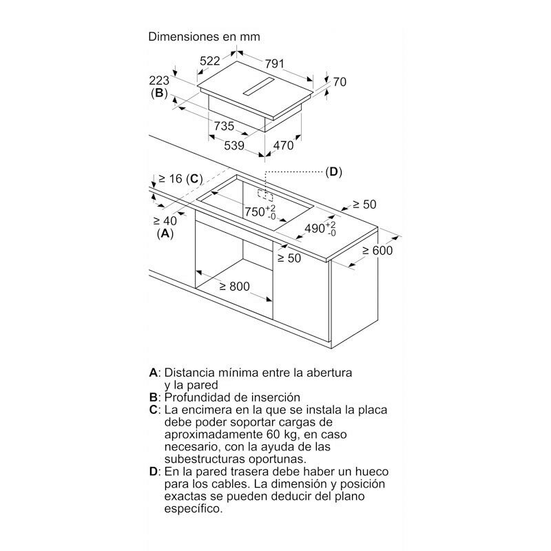 Clase energética B Motor ExtraSilencio con 10 años de garantía. Funcionamiento a intervalos. Potencia máxima de extracción en salida al exterior (según UNE/EN 61591): 622 m3/h Potencia máxima de extracción en recirculación (según EN 61591): 500 m3/h Nivel de ruido máximo en salida al exterior (según EN 60704-3): 69 dB e 1 pW Potencia máxima de extracción en recirculación (según EN 61591): 595 m3/h Indicador electrónico de saturación de filtros de carbón activo Filtros antigrasa lavables en lavavajillas Función Eliminación total de humos Extractor con AutoFuncionamiento al encender la zona de cocción, el sensor detecta el nivel de humos y olores y ajusta el nivel de la extracción en consecuencia Compartimento interior de líquidos derramados (lavable en lavavajillas) de fácil acceso Puede instalarse con salida de aire al exterior o en recirculación, sin canalización o con canalización total o parcial. Importante consultar los planos de instalación y los accesorios necesarios para cada caso