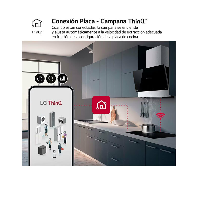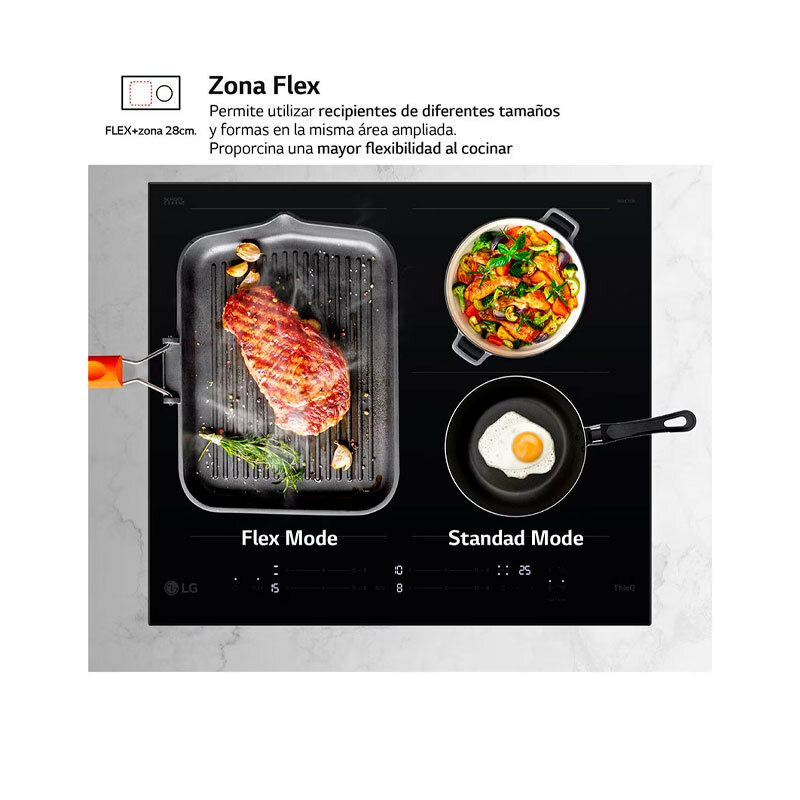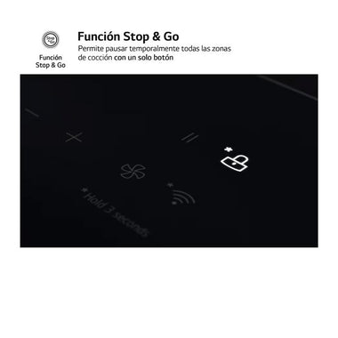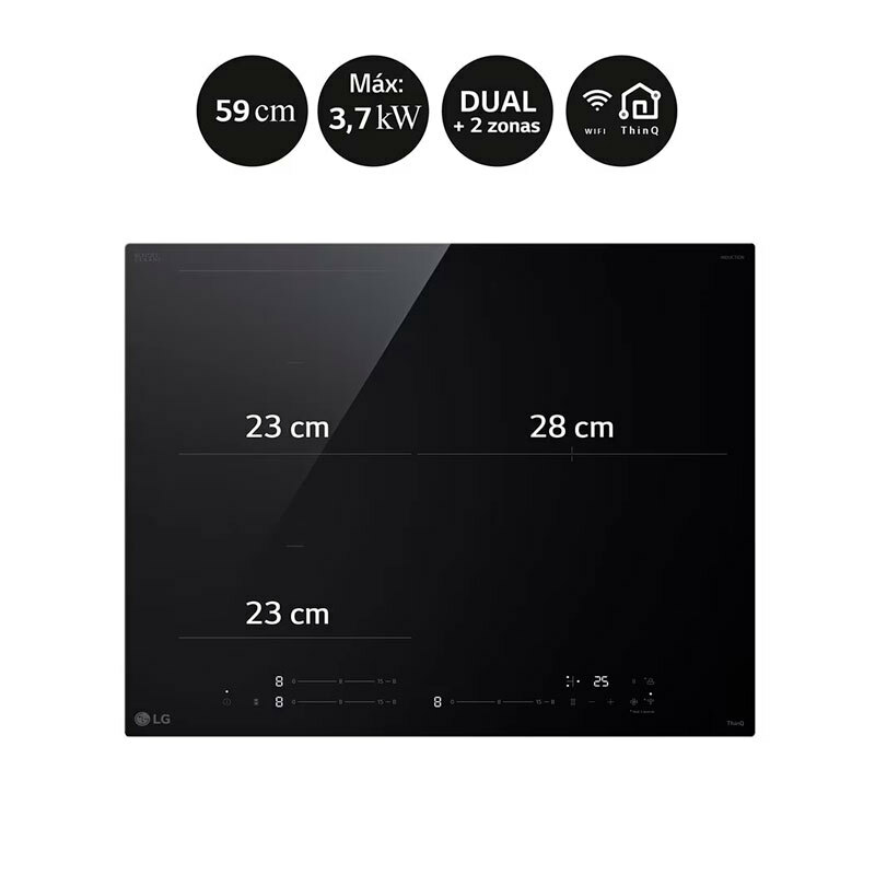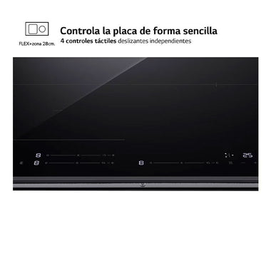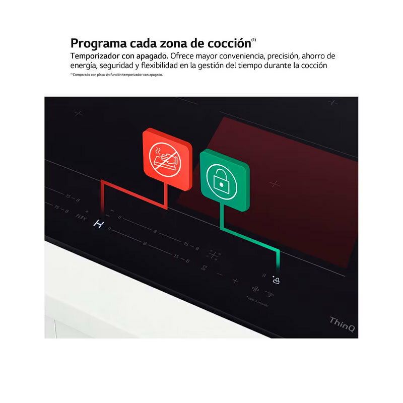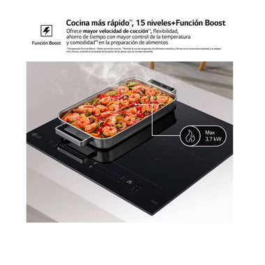 *¡¡Cocina inteligente:!! Placa de inducción y campana en sincronía. Con la placa de inducción y la campana sincronizadas a través de la aplicación LG ThinQ™, puedes concentrarte en cocinar mientras la app se encarga del resto. La aplicación ThinQ™ permite controlar cada fuego, el temporizador, y monitorizar el uso diario, semanal y mensual. Imagen de una placa de inducción y un teléfono inteligente conectados a través de ThinQ. Hay un icono que expresa las funciones de ThinQ, encendido / apagado, monitorización, monitorización de tiempo de uso. *¡¡Fácil control:!! Toma el control con un simple toque de tu dedo. Los controles táctiles independientes de tipo deslizante permiten encender / apagar y ajustar la potencia de cada fuego. *¡¡Alto rendimiento:!! Máxima potencia cuando lo necesites. Cocina a una potencia máxima de 3,7 kW utilizando dos quemadores en Modo Flex. Al activar la función Boost en modo Flex, el agua hierve aún más rápido y se reduce el tiempo de cocción. *¡¡Seguridad en tu cocina:!! Para evitar quemaduras accidentales, la placa dispone de indicadores luminosos que indican cuándo la superficie está caliente y permanecen encendidos hasta que se enfría. *¡¡Cuida de los tuyos:!! El bloqueo de seguridad para niños evita que los niños enciendan accidentalmente la placa de inducción.