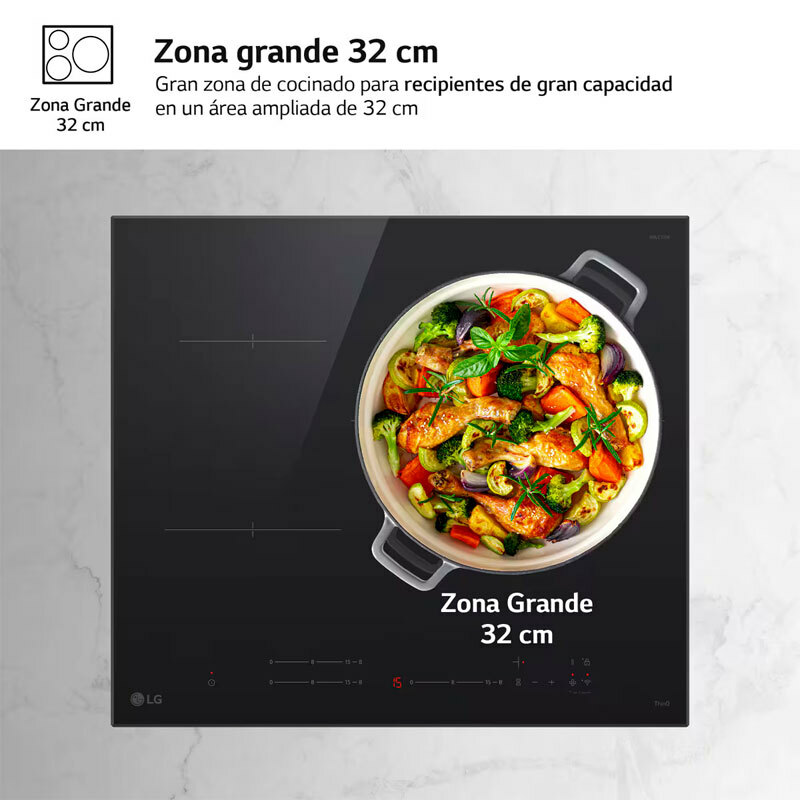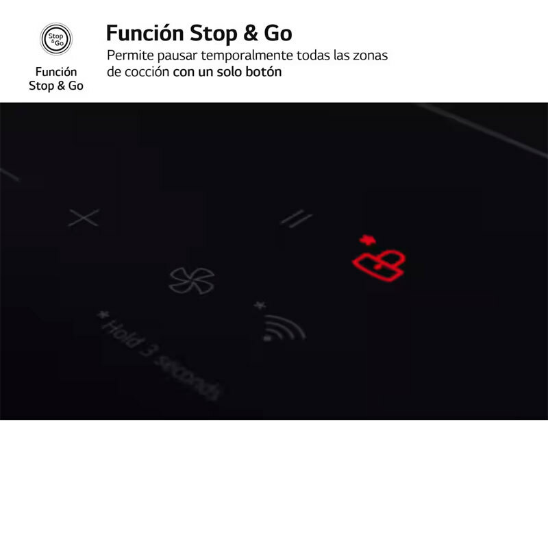 Controla la placa de forma sencilla 3 controles táctiles deslizantes independientes. - Programa cada zona de cocción / Temporizador con apagado Ofrece mayor conveniencia, precisión, ahorro de energía, seguridad y flexibilidad en la gestión del tiempo durante la cocción. - Conectividad Wifi / Conexión placa - cocina Cuando están conectadas, la campana se enciende y ajusta automáticamente a la velocidad de extracción adecuada en función de la configuración de la placa de cocina. - Cocina más rápido Potencia: 7,4kW - Función Boost: 3,7 kW. Ofrece mayor velocidad de cocción, flexibilidad, ahorro de tiempo con mayor control de la temperatura y comodidad en la preparación de alimentos. - Función Stop & Go Permite pausar temporalmente todas las zonas de cocción con un solo botón. Esto es especialmente útil en situaciones en las que se necesita interrumpir la cocción de forma rápida y temporal, como responder a una llamada telefónica o atender una situación urgente en la cocina.