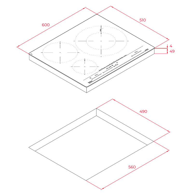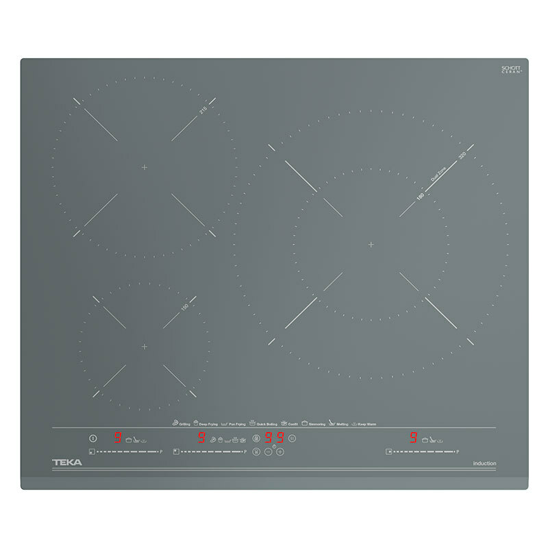 3 Zonas de inducción: - 1 Zona de Ø 150 mm - 1 Zona de Ø 215 mm con sensores de temperatura - 1 Zona de doble circuito de Ø 180 / 320 mm