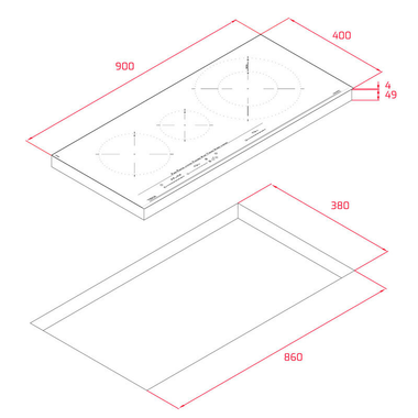 3 Zonas de inducción: - 1 Zona de Ø 150 mm - 1 Zona de Ø 215 mm con sensores de temperatura - 1 Zona de doble circuito de Ø 180 / 320 mm