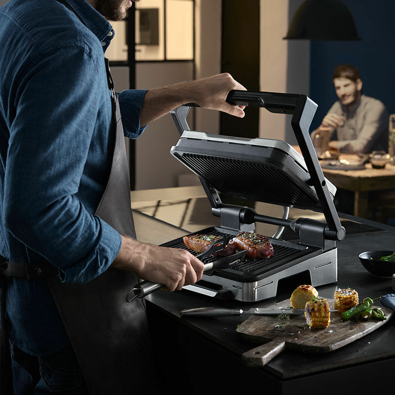 Tecnología de sensor automático: control automático de la temperatura y ajuste del tiempo de cocción según el tamaño y el grosor de los alimentos que se van a asar, para obtener unos resultados de asado perfectos*Pantalla táctil: una pantalla táctil fácil de usar con indicadores LED detrás del vidrio de alta calidad garantiza una experiencia de asado en interiores que no podría ser más fácil*Facilidad de uso: con ajustes para una amplia variedad de ingredientes y recetas, seis Programas de cocción y modo manual para asar a la parrilla los resultados según sus necesidades*Limpieza sin esfuerzo: dos rejillas extraíbles de aluminio fundido a presión con estructura acanalada y el revestimiento antiadherente garantizan una fácil limpieza*Bandeja recogegrasas extraíble: la práctica bandeja recogegrasas extraíble lo hace más fácil de Limpiar después de cada uso*Seguridad: esta parrilla de contacto es un producto con seguridad probada por TÜV (GS), que cumple con los más altos estándares de seguridad, para deliciosos y saludables preparaciones con una sensación de seguridad completa