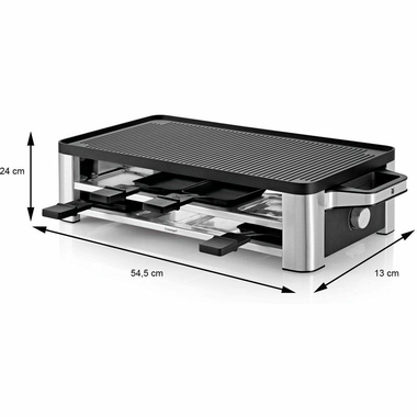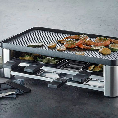 *temperatura variable *8 sartencitas - estacionamiento de bandejas *Acabado Cromargan mate *Ajuste de temperatura variable con luces led *Placa de aluminio fundido reversible, antiadherente para cocinar a la plancha o para preparar dos crepes *8 sartencitas, cada una con su espátula *Práctico estacionamiento de bandejas calientes que no están en uso