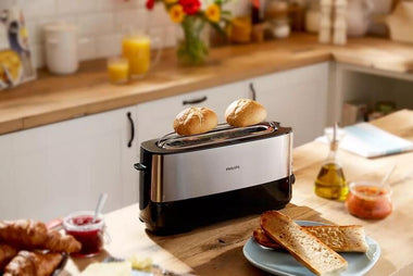 Ranura extra ancha*8 niveles de tostado - Calentador de bollos integrado*Modo para descongelar: El modo para descongelar permite tostar sin esfuerzo pan congelado de una vez con solo tocar un botón*Modo para recalentar: Calienta pan tostado previamente en segundos con solo tocar un botón*Diseño de ranura larga: Una única ranura larga se adapta a cualquier tipo de pan que elijas*Sistema de centrado automático: La rejilla con centrado automático garantiza un tostado uniforme por ambos lados mediante el bloqueo de cada rebanada, gruesa o fina, en el centro de la ranura.*8 ajustes de tostado: Ajusta el tiempo de tostado para cualquier pan y cómo te guste*Rejilla calientabollos integrada que permite calentar tortas, bollos, croissants y mucho más*Botón de cancelación para apagarla al instante detiene el tostado en cualquier momento para ofrecer un funcionamiento seguro y preciso*Protección con desconexión automática: La desconexión automática en caso de que el pan se atasque protege contra cortocircuitos*Ranura extraancha que admite cualquier rebanada, tanto si la tostada te gusta gruesa, como fina o algo intermedio