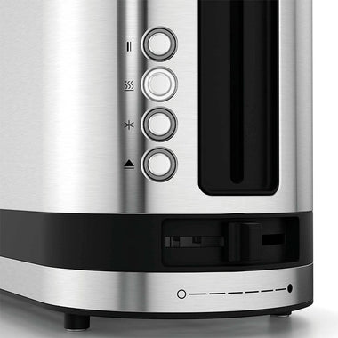 Cuerpo en acero inoxidable Cromargan® mate de alta calidad Espacio para dos tostadas XXL o 1 rebanada de pan Rejilla adicional integrada para panecillos Ajustes de tueste variables Aislamiento Keep Cool Centrado del pan integrado, para un tueste uniforme Bandeja de migas Soporte calentador Funciones que se iluminan con luz LED para: calentar, tostar por solo un lado, volver a tostar y descongelar