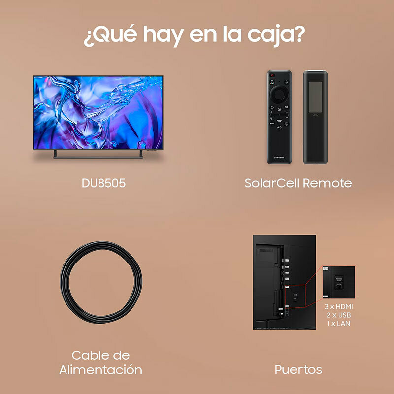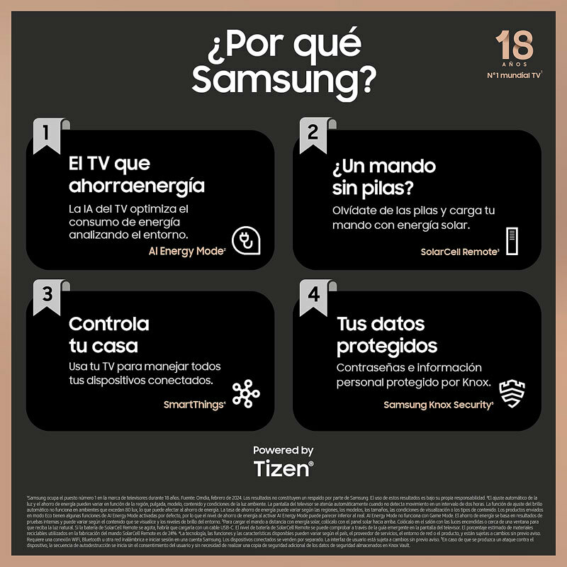 *¡¡Dynamic Crystal Color:!! Colores increíbles. Imágenes reales con colores más puros y naturales con resolución 4k. *¡¡4K Upscaling.!! Disfruta tu contenido favorito en 4K. La Inteligencia Artificial mejora cada escena a calidad 4K sin importar la resolución original. *¡¡El mejor Smart TV:!! Entretenimiento de otro nivel con Samsung Tizen OS. Contenidos, más de 100 canales gratuitos y en exclusiva, juegos en la nube y todos tus dispositivos conectados. *¡¡Samsung TV Plus:!! TV Gratis. Olvídate de suscripciones y disfruta de canales y programas gratuitos. 103 canales de géneros como noticias, entretenimiento, deportes, y más. Accede de forma automática a contenido gratuito integrado en tu TV Samsung sin necesidad de descargas o conectarte a ningúna app. *¡¡Diseño AirSlim:!! Aún más fino. Un diseño nunca antes visto en esta categoría, tu televisor se integra en tu pared a la perfección. *¡¡Procesador Crystal 4K:!!Colores increíbles. Siente cada color como si lo vieras en la vida real. Este procesador te asegura una resolución 4K de alta calidad. *¡¡Contrast Enhancer Percepción mejorada del contraste y el color:!! Contrast Enhancer ajusta constantemente el contraste de tu pantalla para que disfrutes de una sensación mejorada de profundidad y color. *¡¡HDR.!! Aún más contraste. Verás todos los detalles de cada escena sin importar si son luminosas u oscuras. *¡¡Gaming Hub:!! Juega sin descargas. Samsung Tizen OS te permite acceder a tus plataformas favoritas de cloud gaming, juegos y apps, sin necesidad de consola y disfrutando más de 3.000 juegos. Te recomienda juegos basado en tus gustos para que puedas encontrarlos de una forma fácil y rápida. *¡¡Motion Xcelerator:!! Gana todas las partidas. Disfruta de imágenes más claras gracias a Motion Xcelerator, que estima y predice automáticamente el movimiento entre fotogramas para mejorar las transiciones y crear imágenes suaves y fluidas. *¡¡Modo de Baja Latencia Automático (ALLM):!! Confía en tus reflejos.Juego fluido sin desenfoque ni vibraciones. Con el reducido lag de entrada (ALLM) confía en tus reflejos sin que la rapidez de respuesta te falle. * El nivel bajo de latencia se ha medido en condiciones de testeo interno y está sujeto a cambios en función de los ajustes del juego o de las condiciones específicas. *¡¡Q-Symphony:!! Televisor y barra de sonido en perfecta armonía. Déjate envolver por un sonido orquestado en perfecta armonía. Q-Symphony permite que los altavoces de tu barra de sonido y los del televisor se sincronicen para funcionar simultáneamente y crear así un mejor efecto envolvente sin necesidad de desactivar los altavoces del televisor. *¡¡Object Tracking Sound Lite (OTS Lite):!! El sonido que sigue a la acción. Un sonido 3D con los canales virtuales superiores que te harán disfrutar de una experiencia inmersiva. *¡¡Adaptive Sound:!! Suena como tiene que sonar. Adaptive Sound optimiza el sonido en tiempo real en función a las escenas y el contenido gracias a la Inteligencia Artificial. *¡¡Map View 3D.!! El TV, el cerebro de la casa. Controla mejor tu hogar gracias a la monitorización intuitiva que te permite gestionar tus electrodomésticos y dispositivos con IoT mediante un mapa 3D de tu casa. También te muestra en el televisor notificaciones sobre el estado de tus electrodomésticos. *¡¡Samsung Daily+:!! Tu vida bajo control. A través del ecosistema abierto Samsung Tizen OS, Daily+ te permite controlar todas tus actividades diarias desde tu TV. Daily+ incluye apps y servicios como SmartThings, Workout Tracker, Workspace y mucho más. *¡¡Controla tu casa:!! Optimiza el uso de tu dispositivos y vive una vida más inteligente adaptada a tus necesidades gracias a la app SmartThigns integrada en tu TV. Hay miles de dispositivos compatibles que simplificarán tu día a día. Además, puedes utilizar tu pantalla como mando de control de tu casa con el 3D Map View *¡¡Espacio de trabajo:!! Trabaja y estudia cómodamente desde casa. Accede a tu ordenador y tus dispositivos móviles fácilmente en la pantalla de tu televisor para trabajar y estudiar desde la comodidad del salón. *¡¡Asistentes de voz integrados:!! Contrólalo todo con la voz. Elige tu asistente de voz favorito: Bixby o Amazon Alexa. Por primera vez, están integrados en tu TV Samsung para proporcionarte la mejor experiencia de entretenimiento y control de tu hogar. *¡¡Peana ajustable:!! ¿Con o sin barra? Consigue una experiencia de visionado perfecta ajustando la altura de la peana de tu TV. Súbela si tienes una barra de sonido para que no se meta en la pantalla.